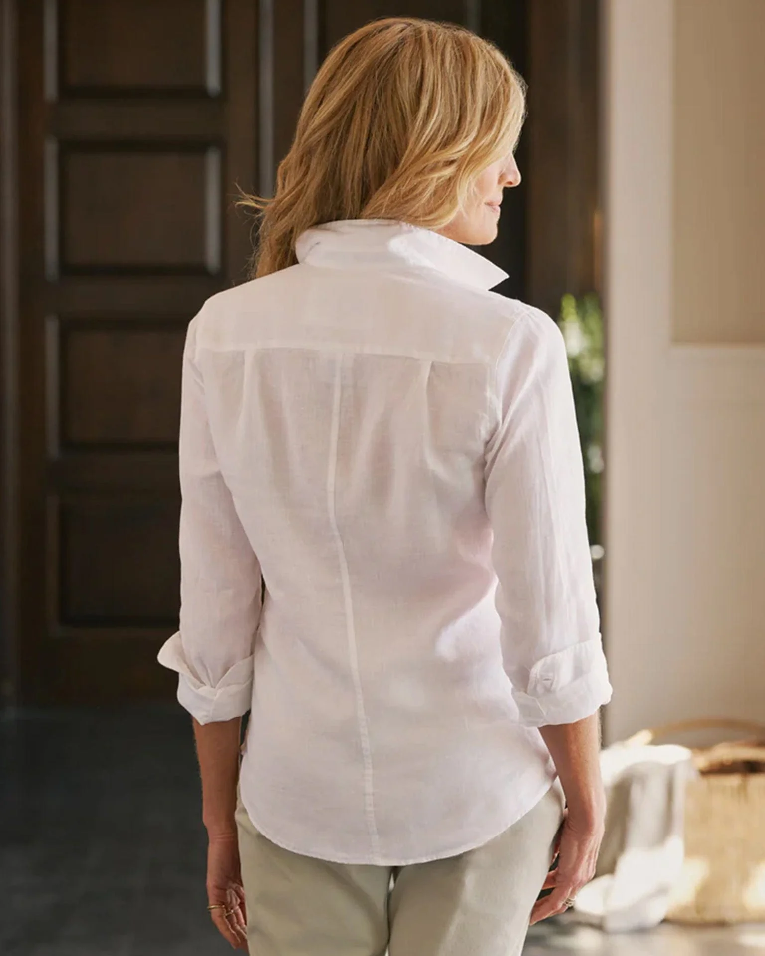 Meet Barry! Classic in style and sharply tailored to hug your waist and back, this button up curves in all the right places. Featuring Frank & Eileen's signature single pocket, hip-skimming hemline, and bust-flattering button placement, this cut runs small. If in doubt, size up!